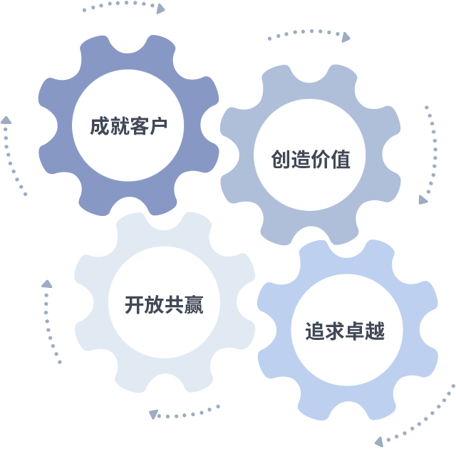 成就客户是一切决策的出发点,,,创造价值是衡量所有工作的标准,,,,追求卓越是我们做事做人的态度,,,开放共赢是我们的格局也是最终的结果。。价值观的齿轮环环相扣,,,推动着组织里的每个人不断向前。。